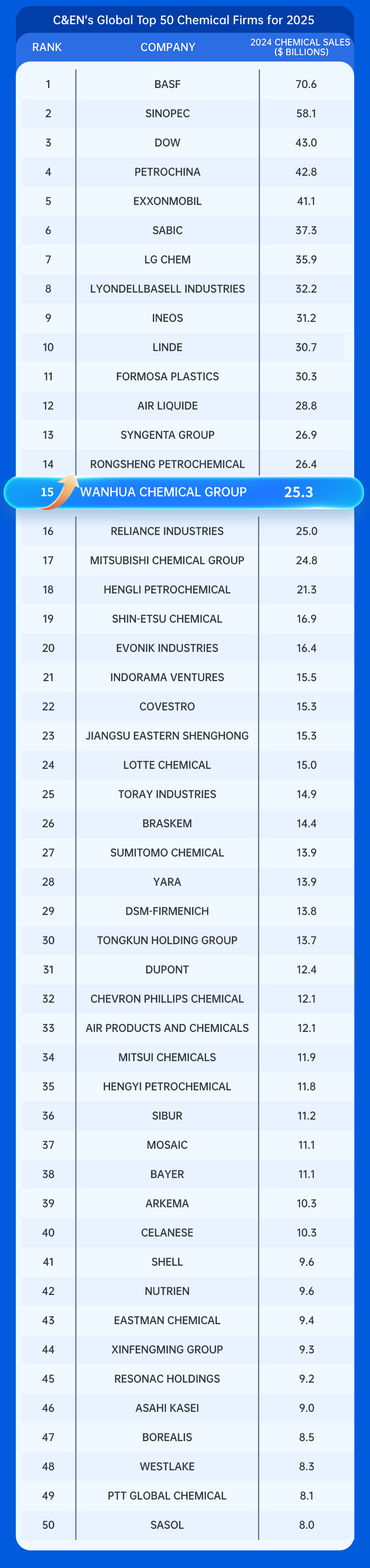 7月23日,C&EN(《化学与工程新闻》)发布最新全球化工企业50强排行榜(Global Top 50 Chemical Firms),对全球范围内主要化工企业进行了排名,z6人生就是博化学位列第15位,较去年上升1位。